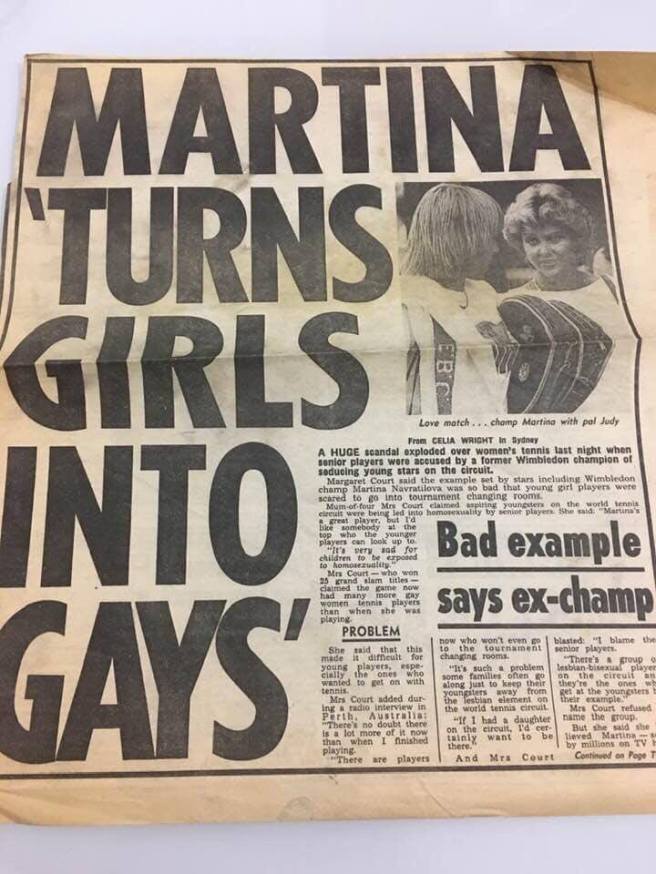 So how does Martina perform this alchemy of turning “girls into gays”? Who exactly did she seduce? You have to turn inside the paper to find that “Mrs Court did not suggest that Martina had ever acted improperly towards young tennis girls.” So, what about this headline, then? “Mrs Court … admitted that she ADMIRED Martina for being so open about her sexual preferences. She said she believed the player had no alternative because ‘it would have been impossible for her to cover it up.’”